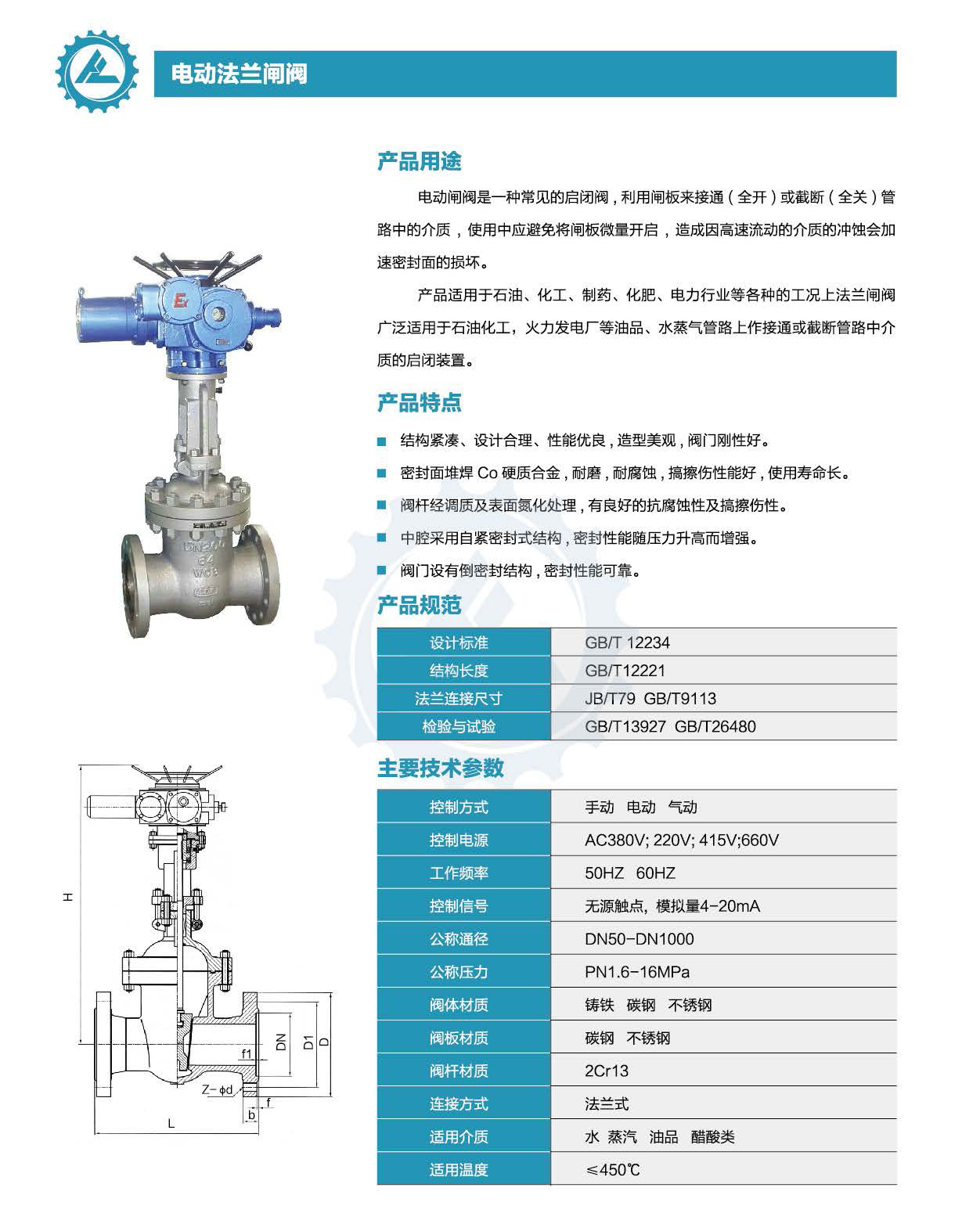 公司主要生产电动成套阀门系列:电动闸阀、电动截止阀、电动球阀、电动蝶阀、电动通风蝶阀、电动水闸门、电动盲板阀等各类国标以及非标类电动阀门。